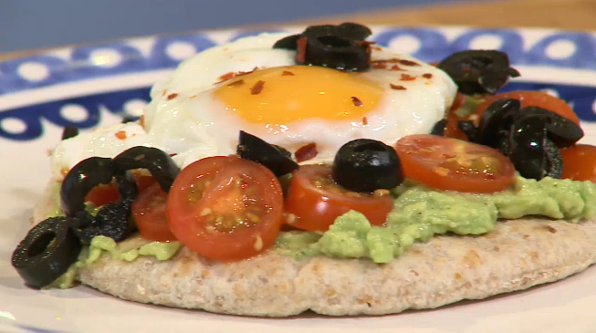 Verhit een scheutje olie in een pan, breek de eieren voorzichtig en bak de eieren op laag vuur gaar. Laat de dooiers heel en zacht. Rooster de pitabroodjes in de broodrooster krokant. Maak de avocado schoon en prak het vruchtvlees fijn met een vork. Breng op smaak met het sap van de citroen, een beetje zout en versgemalen peper. Snijd de tomaatjes in plakjes. Besmeer de pitabroodjes met de avocado en leg de tomaatjes erop. Snijd de olijven doormidden. Verdeel de eieren erover en bestrooi met de chiliflakes en de olijven.