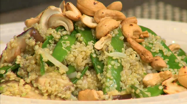 - Verdeel de quinoawok met peultjes over borden en strooi de koriander en de cashewnoten erover.