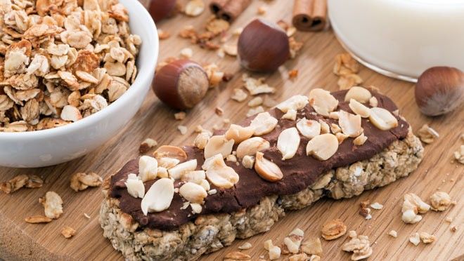 Verwarm de oven voor op 180 ºC. Rasp de sinaasappel op een fijne rasp. Pel de banaan en leg deze samen met de sinaasappelrasp, pindakaas, ei, honing en boter in het bakje van de staafmixer. Draai dit tot een pasta. Spatel hier pinda’s, hazelnoten en havermout doorheen. Duw dit stevig aan in een cakeblik. Bak circa 25 minuten in de oven en laat afkoelen. Laat de chocolade au bain-marie smelten. Schenk de chocolade in de ovenschaal en bedek de havermoutreep ermee. Laat de chocolade niet te lang uitharden, maar snijd er direct 8 repen uit. Zet de ovenschaal met de repen in de koelkast om uit te harden.