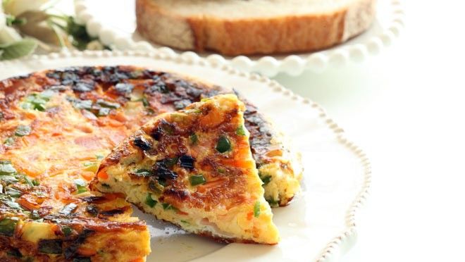 - Verhit een scheutje olijfolie in een koekenpan en bak de groente circa 5 minuten. Voeg het eimengsel toe aan de groente en bak de omelet circa 5 minuten op middelhoog vuur gaar.