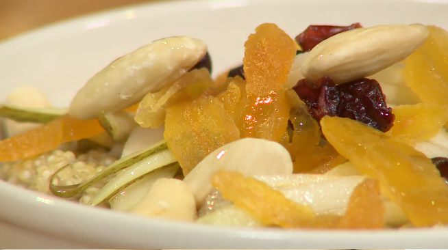 Breng de amandelmelk met de quinoa aan de kook en kook circa 15 minuten op laag vuur tot de meeste melk is opgenomen. Roer de quinoa tussentijds een paar keer los. Rooster de amandelen in een droge koekenpan goudbruin en laat afkoelen op keukenpapier. Snijd de peren in reepjes en verwijder het klokhuis. Snijd de abrikozen in reepjes. Meng de abrikozen, cranberries en de peer door de quinoa en verdeel over diepe borden. Bestrooi met amandelen en breng op smaak met ahornsiroop.
