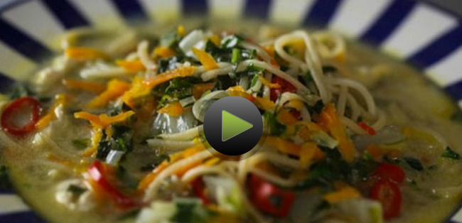 - Voeg 5 minuten voorhet einde van de kooktijd de paksoi, wortel en noedels toe.