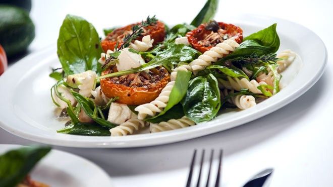 - Meng in een grote kom de pasta, twee derde van de kaas, zongedroogde tomaten, walnoten, boerenachterham, spinazie, rode pesto, olijfolie extra vierge en de balsamicoazijn. Breng op smaak met een beetje zout en versgemalen peper en bestrooi met de rest van de oude kaas.