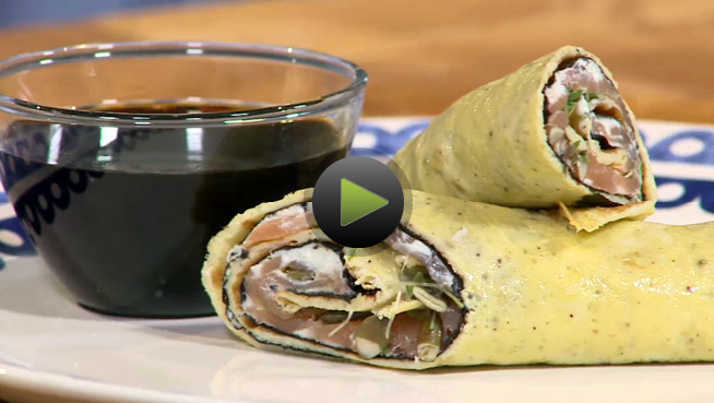 Snijd de omeletten schuin doormidden en serveer ze met sojasaus.