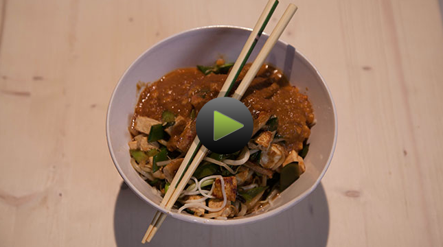 - Verdeel de noedels, wokgroente en de gekaramelliseerde bananenover borden. Lepel de pinda-kokossaus erover.