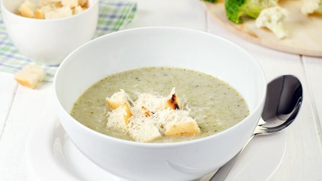 Broccoli-bloemkoolsoep met verse knoflookcroutons