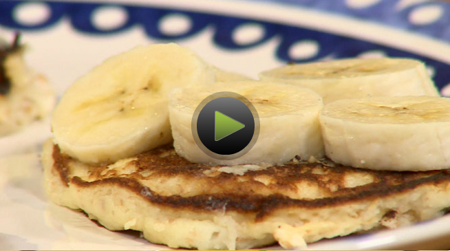 Splits de eieren en klop de eiwitten stijf. Snijd de gembernootjes fijn. Meng in een kom het volkorenmeel met het bakpoeder, kokosrasp, gember en het zout. Meng in een andere kom de eidooiers met de ricotta, gembersiroop en de melk. Meng het natte mengsel met een garde door het droge mengsel en spatel de eiwitten erdoor. Verhit een scheutje olie in een pan en bak kleine pannenkoeken van het beslag. Snijd de bananen in dunne plakken. Verdeel de pannenkoekjes over borden en beleg met de plakjes banaan.