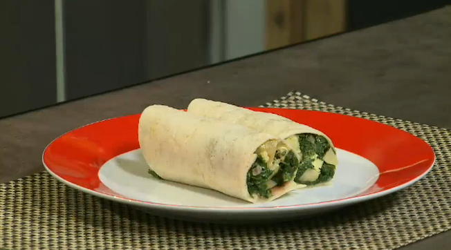 Beleg de tortilla’s met bacon, groente, ei en verdeel de saus erover. Rol de tortilla’s op en verdeel ze over borden.