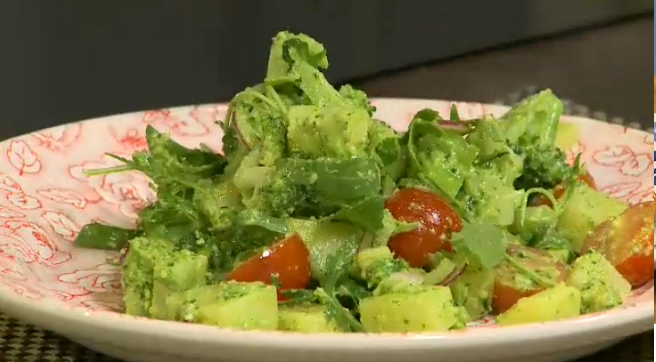 - Meng in een grote kom de aardappels, hazelnotenpesto, broccoli, cherrytomaten, rode ui en de rucola.