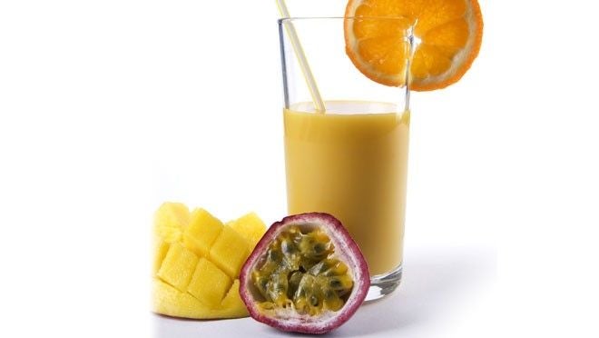 Pel de sinaasappels en snijd deze in vieren. Snijd de mango van de pit en verwijder de schil, snijd het vruchtvlees in blokjes. Pel de bananen. Halveer de passievruchten en lepel het sap eruit met de pitten. Draai alle ingrediënten fijn in de blender totdat deze glad is. Zeef de smoothie voor het serveren.
