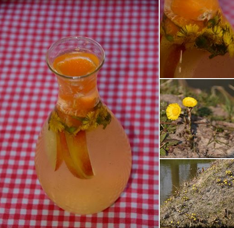 Klein Hoefblad groeit in het wild. De bloemen lijken op die van de Paardenbloem, maar de steel is anders. Ze zijn nu bijna uitgebloeid, als je ze niet kunt vinden kun je ook Paardenbloemen in het water doen. (die zijn weer goed voor de lever)