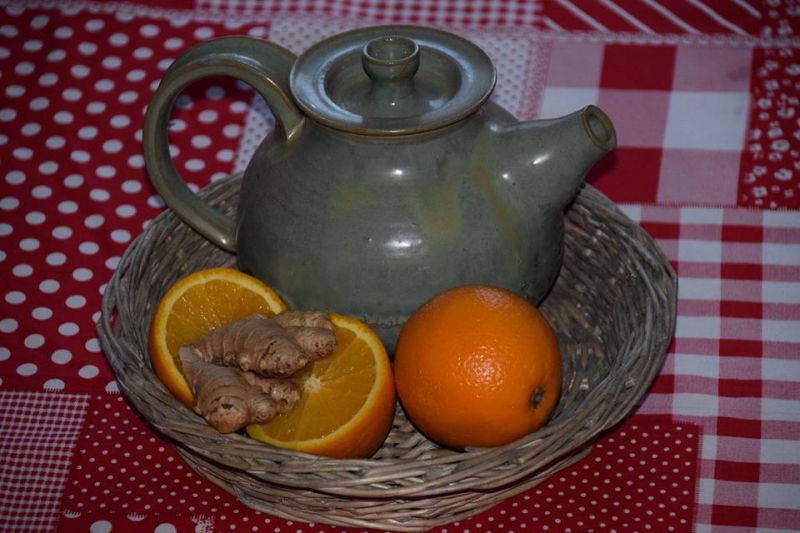 Nodig per beker thee: 1 plakje verse gemberwortel en een halve sinaasappel.